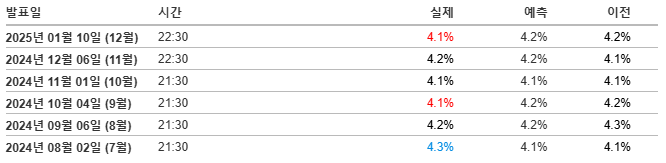 안녕하세요. 2025년 1월 10일 (미국 시각) 미국 실업률 발표가 있었습니다. 발표 결과 예측치 하회한 것으로 실제치가 발표 되었습니다. 이와 관련해서 예측치 하회 내용을 바탕으로 미국 증시에 미칠 영향에 대해서 설명 드리도록 하겠습니다.