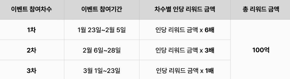 이벤트 참여기간에 따라 차등적으로 총 100억 상당 리워드 지급 (빠르게 참여할수록 더 큰 혜택 지급)