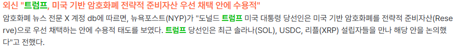 특히 주목할 만한 것은 솔라나의 움직임입니다. 트럼프가 암호화폐 분야에서 전략적 채택 자산으로 리플과 함께 솔라나를 언급했다는 점은 매우 중요한 의미를 가집니다. 이는 솔라나가 리플과 함께 상승할 가능성이 매우 높다는 것을 시사합니다.
