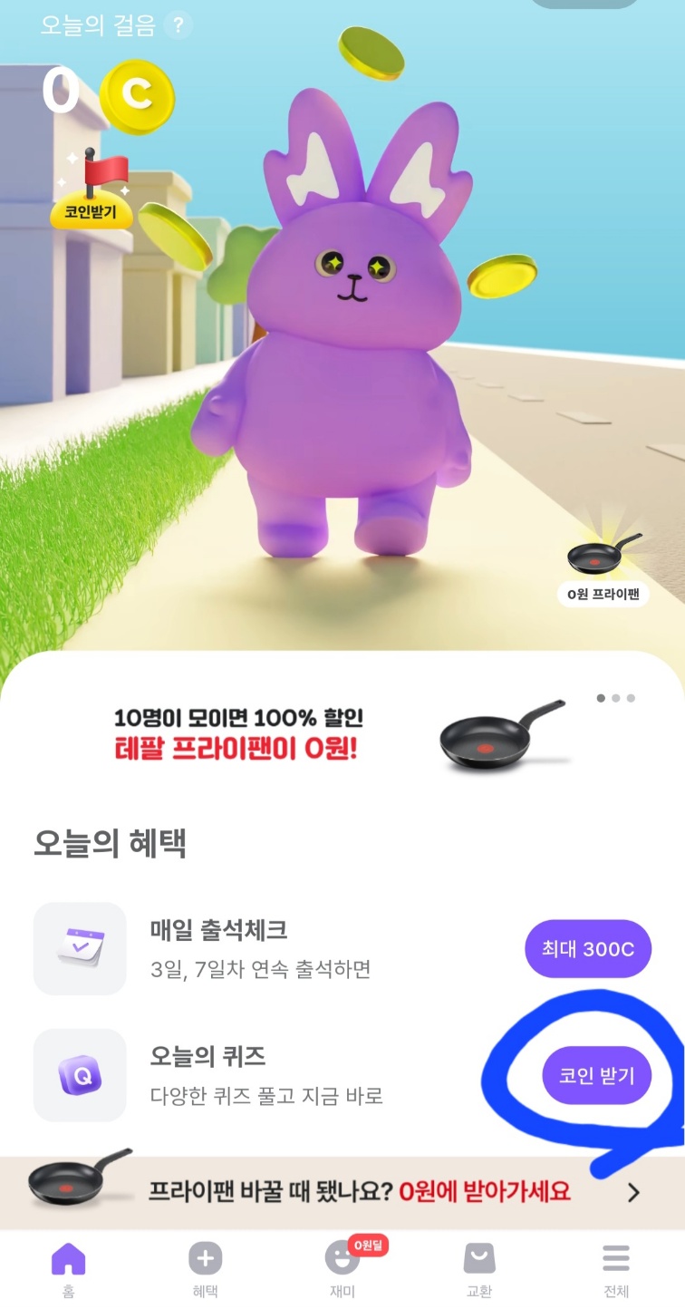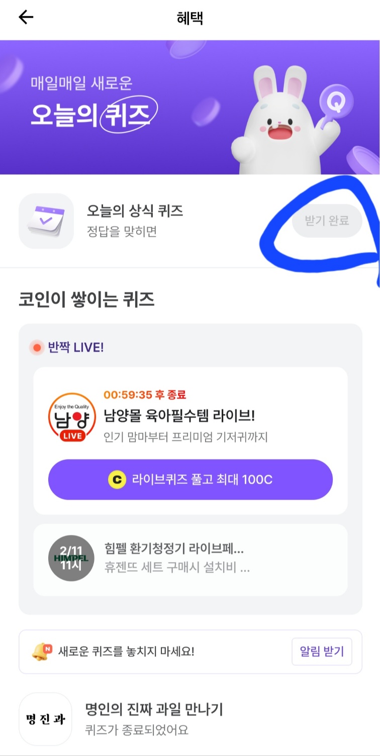앱 실행 -> 메인 보드 상 오늘의 퀴즈 '코인 받기' 선택 -> 오늘의 상식 퀴즈 받기 선택 (이미 퀴즈를 푼 상태라 받기완료된 상태로 보입니다.) -> 퀴즈 풀기