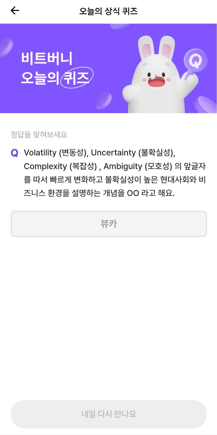 지금까지 비트버니 오늘의 퀴즈 정답에 대해 알려드렸습니다. 리워드 많이들 쌓으셔서 암호화폐 구매에 도움이 되셨으면 좋겠습니다.