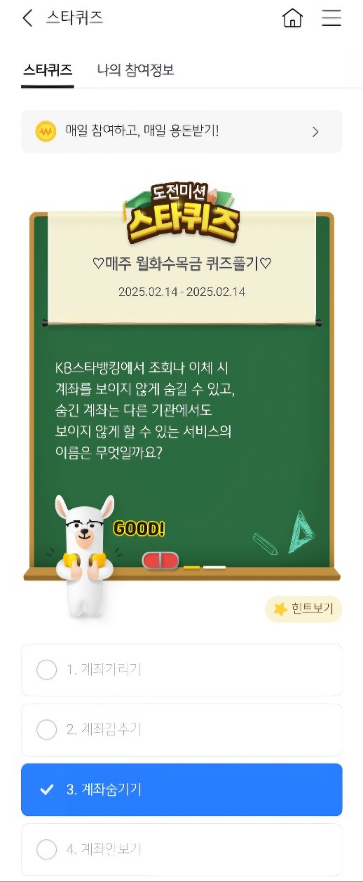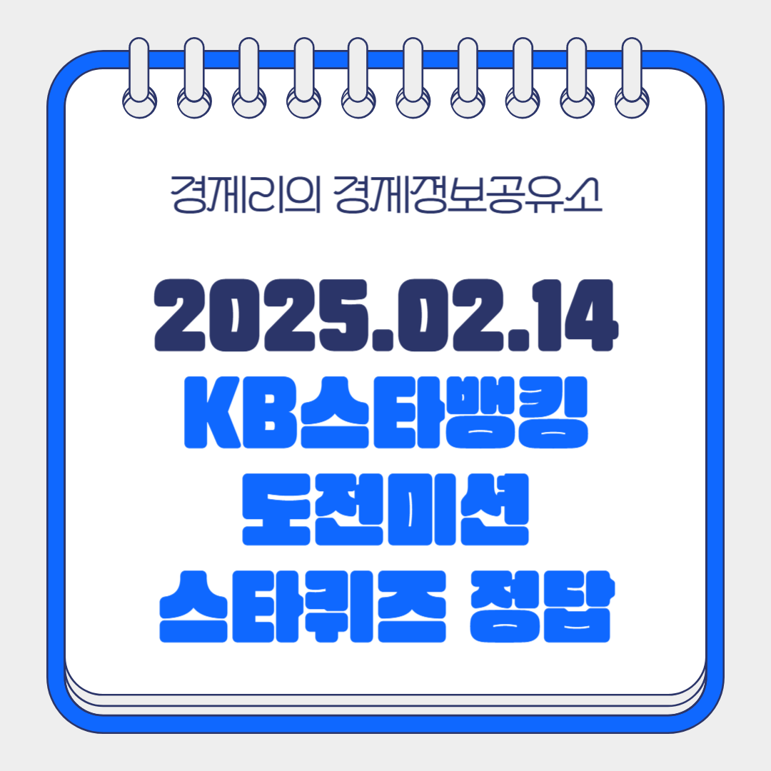 매주 월화수목금 퀴즈인 KB국민은행의 KB스타뱅킹 2025년 2월 14일 도전미션 스타퀴즈 정답을 공유드리고자 합니다. 바로 알려드리겠습니다.