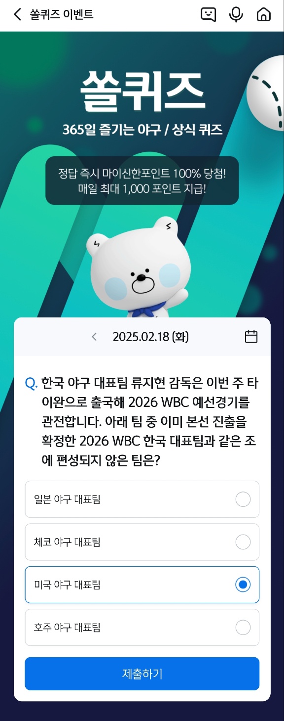 2025.02.18 (화) 신한은행 쏠퀴즈 365일 즐기는 야구 / 상식 퀴즈 정답 공유드립니다.