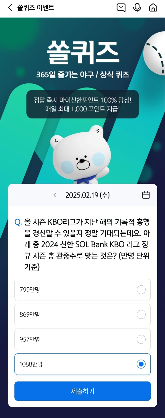 2025.02.19 (수) 신한은행 쏠퀴즈 365일 즐기는 야구 / 상식 퀴즈 정답 공유드립니다.